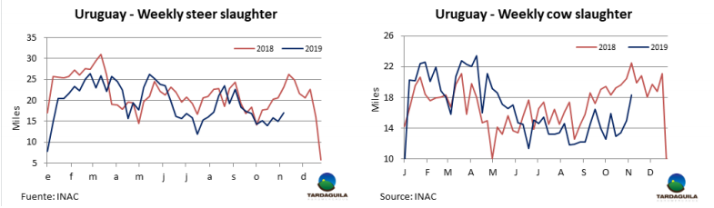 歐洲481配額讓牛只屠宰活動再次活躍起來,上周牛只屠宰量3超過4萬頭,在9月14日至今8周來達到的最大量。烏拉圭肉協(xié)報道,截止10月9日的一周,42644頭牛被送往合規(guī)的屠宰場,比上一周增長7626頭,增長了21.8%,與去年同期仍相差1.1萬頭。本周所有品種屠宰量都有增長,包括母牛。屠宰量最大的品種就