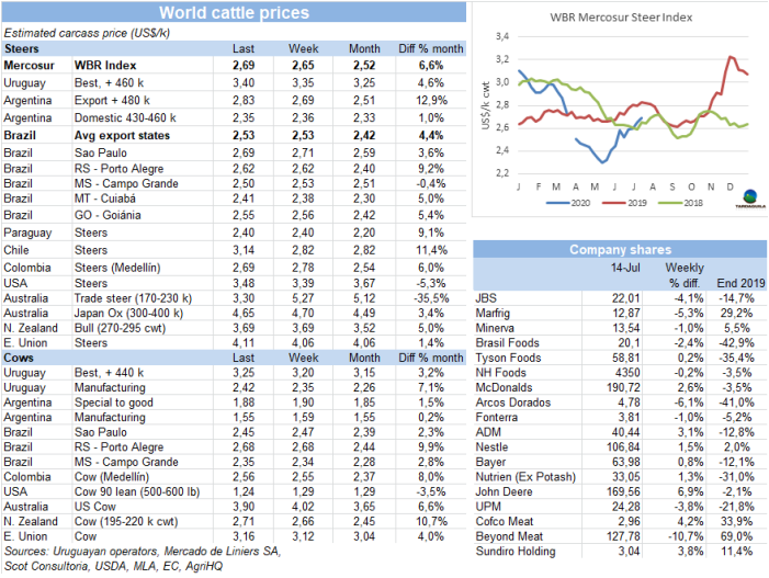 巴西屠宰活動(dòng)穩(wěn)定,阿根廷成為南方共同市場閹牛平均價(jià)格上漲的主要推手。本周南方共同市場閹牛價(jià)格指數(shù)上漲4美分,上漲至2.69美元/公斤。隨著歐洲冰鮮牛肉產(chǎn)品價(jià)格上漲,本周阿根廷閹牛出口價(jià)格上漲10比索/公斤,美元價(jià)格,加上9%的出口稅,達(dá)2.83美元/公斤,一周內(nèi)上漲14美分。烏拉圭牛價(jià)上漲5美分/公斤,上漲至3.4美元/公斤。巴西和巴拉圭活牛參考價(jià)保持穩(wěn)定,分別為2.53美元/公斤和2.4美元/公斤。