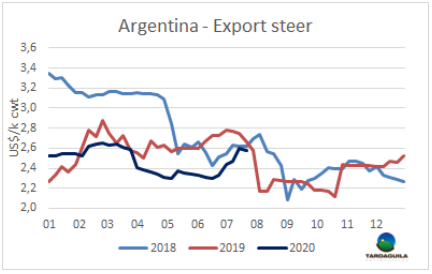 歐盟昨日宣布的大規(guī)模經(jīng)濟(jì)刺激計(jì)劃,以及新冠肺炎疫苗研制進(jìn)展的利好消息,帶動了市場的樂觀情緒,推高了主要股指,新興國家貨幣也有升值。昨天巴西雷亞爾增值2.4%,較一周前增值3%,促進(jìn)牛價(jià)堅(jiān)挺。巴西主要出口州育成牛雷亞爾平均價(jià)格上漲了0.7%,美元價(jià)格上漲0.9美分,上漲至2.62美元/公斤。巴拉圭和烏拉圭牛價(jià)保持冬季一直以來的上行趨勢。巴拉圭閹牛報(bào)價(jià)2.45美元/噸,烏拉圭牛價(jià)要高出1美元,3.43美元/噸。阿根廷出口閹牛比索價(jià)格與上周保持不變,由于比索官方匯率珠江下跌,美元價(jià)格下跌2美分至2.81美元/公斤。南方共同市場活牛價(jià)格指數(shù)本周上漲5美分,上漲至2.74美元/公斤。