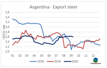 用于出口的牛價格已經(jīng)恢復(fù)了元氣,不過由于以色列假期和歐洲需求的下降,預(yù)計牛價將會下降。最好的英國純種閹牛成交價191-196比索/公斤,印度串種閹牛186-190比索/公斤,特優(yōu)種母牛158-163比索,工業(yè)母牛價格在136-143比索/公斤。
