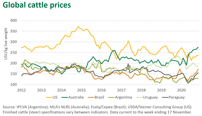 全球牛價(jià)漲跌不一,受各種供求因素在全年影響價(jià)格的劇烈波動(dòng)。目前,美國新冠病例數(shù)量的增加、南美的干旱情況以及澳大利亞各地季節(jié)性情況的變化仍是影響牛價(jià)的關(guān)鍵因素。今年早些時(shí)候,降雨促進(jìn)了行情拐點(diǎn)的到來,導(dǎo)致澳大利亞的牛價(jià)飆升,因?yàn)樯a(chǎn)者希望在長(zhǎng)時(shí)間的大量成交后補(bǔ)充供應(yīng)水平。隨著對(duì)牛的需求升溫,澳大利亞各地的后備牛的價(jià)格高于種牛和待宰牛,達(dá)到創(chuàng)紀(jì)錄水平。通常情況下,澳大利亞的牛價(jià)一般于與烏拉圭保持一致,低于美國的水平。然而,MLA表示,自6月以來,澳大利亞牛價(jià)一直處于世界最高水平。