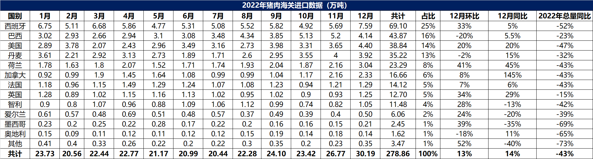 2022年12月中國主港豬肉進口量30.19萬噸,環(huán)比+13%,同比+14%。全年中國主港豬肉進口總量278.86萬噸,同比-43%。12月豬肉前四大進口來源國依然是西班牙、巴西、美國、丹麥,分別占當月進口量的25%、16%、14%、13%。