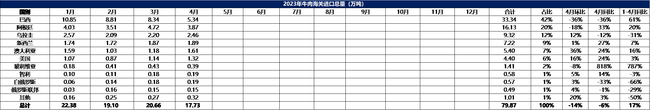 2023年4月中國主港牛肉進口量17.73萬噸,同比減少6%,環(huán)比減少14%。1-4月累計主港牛肉進口量79.87萬噸,同比增加17%。前五大進口來源國仍為巴西、阿根廷、烏拉圭、新西蘭、澳大利亞。