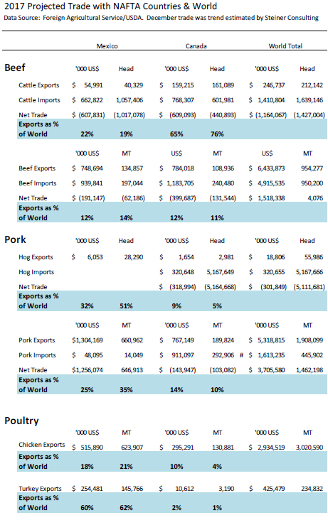 所附表格還包括禽類出口,以計(jì)算肉類/牲畜的貿(mào)易平衡。在2017年與墨西哥的貿(mào)易額為順差12億,加拿大為逆差11億6千5百萬美元,從而得到一個(gè)結(jié)論,根據(jù)牲畜/禽類貿(mào)易,如果美國(guó)退出北美自由貿(mào)易協(xié)定,加拿大會(huì)損失更多。