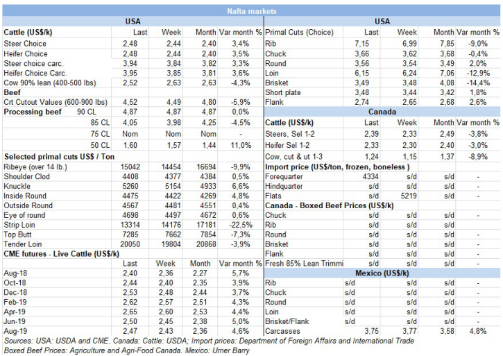 本周各國(guó)貨幣尤其是巴西雷亞爾增值,使閹牛價(jià)格上漲,南方共同市場(chǎng)閹牛指數(shù)上漲5美分到2.69美金。巴西雷亞爾對(duì)美金增值2.5%,部分原因是總統(tǒng)候選人Geraldo Alckmin受歡迎度很高,10月大選前景比較被看好,而且本地牛價(jià)也增加了0.3雷亞爾/公斤,綜合起來(lái)育肥牛價(jià)格漲了7美分到2.41美金,9周以來(lái)最高。烏拉圭閹牛價(jià)格由于供應(yīng)緊缺也漲了,阿根廷牛價(jià)穩(wěn)定,貨幣也穩(wěn)定,連續(xù)四周價(jià)格不變,巴拉圭由于處于口蹄疫接種時(shí)期,市場(chǎng)比較平靜,牛價(jià)保持不變。