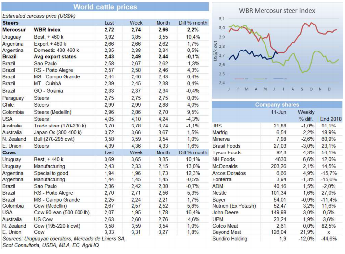 巴西育肥牛價格大幅下跌,拉低了南方共同市場閹牛價格,本周南方共同市場閹牛指數(shù)下跌了2美分到2.72美金/公斤,巴西育肥牛供應(yīng)增加,需求端由于中國市場暫停比較謹慎,有些工廠暫停屠宰,雖然雷亞爾增值0.5%,美金牛價還是跌了6美分到2.43美金。烏拉圭牛價又漲了7美分,達到3.92美金,比第二高巴拉圭的2.75美金還高40%,巴拉圭和阿根廷牛價沒有變化。