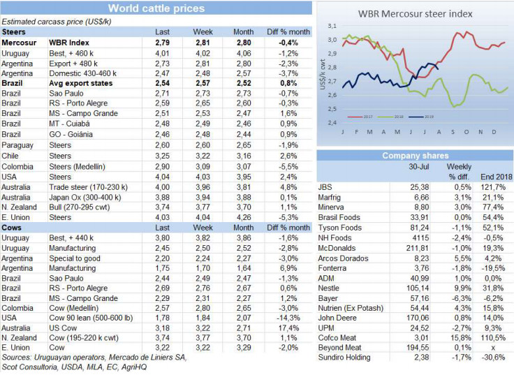 本周育肥閹牛價格小幅下跌,有些地區(qū)活牛供應充足,工廠有足夠的條件壓價,圣保羅州育肥閹牛價格跌了0.5雷亞爾到154.5雷亞爾/15公斤,帶骨牛肉批發(fā)市場價格跌到9.72雷亞爾/公斤,七月累計下跌5.2%。