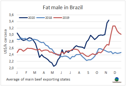 育肥牛價格開始顯示出擺脫自7月中旬以來主導市場的螺旋上升趨勢的跡象。盡管本周大部分養(yǎng)牛州的凈差額為正,但自上周末以來,需求開始回落。工廠為了維持價格,正在適應供應的減少,減少屠宰活動。市場情緒的改變可以從期貨成交價上反映出來,12月期貨成交價293雷亞爾/15公斤,目前的成交價在280雷亞爾/15公斤。2021年五月期貨價格下降至260雷亞爾/15公斤。巴西媒體指出,中國在巴西牛肉包裝中發(fā)現(xiàn)冠狀病毒的消息引起了人們的關注,這可能給目前的主要客戶帶來一些麻煩。圣保羅本周30天付款參考價287.5雷亞爾/15公斤,較上周上漲了5雷亞爾,大坎波和南馬托格羅索州本周價格下跌了4美分,下跌至274雷亞爾/15公斤。批發(fā)市場后部位肉價格受下半月需求走弱影響有下行調(diào)整,最新的參考價為20.85雷亞爾/公斤,前部位肉價格再次上漲,至16.25雷亞爾/公斤。