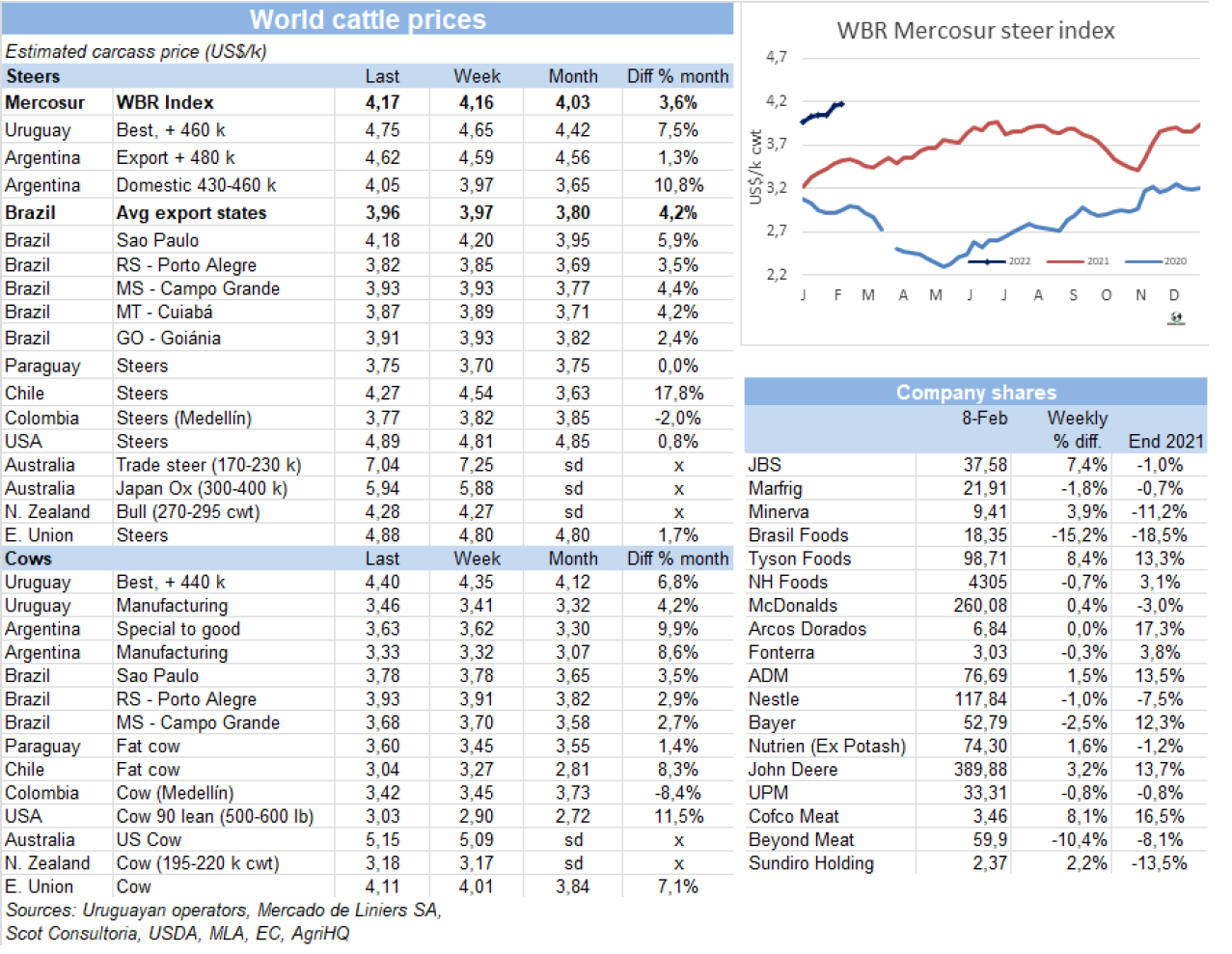 本周南方共同市場閹牛價格指數(shù)上漲了1美分至4.17美元/公斤。不同國家參考價均保持穩(wěn)定,盡管巴西方面育肥牛價格有輕微下調(diào),下跌了1美分至3.96美元/公斤。其他三個國家牛家均為上漲趨勢,烏拉圭牛價目前是南美最高,本周上漲了10美分,達(dá)4.75美元/公斤的新紀(jì)錄。阿根廷出口閹牛價格上漲3美分至4.62美元/公斤,含出口稅。巴拉圭方面供應(yīng)減少,待宰公牛價格上漲了5美分至3.75美元/公斤。