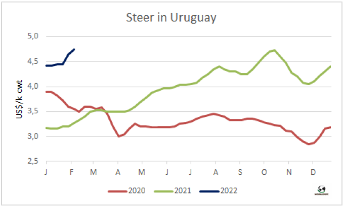 1月烏拉圭對中國的平均出口價格5931美元/噸,比12月的平均價格低43美元。烏拉圭對中國平均出口額連續(xù)11個月的增長畫上句號。2022年1月的平均價格同比增長了49%,這是由于不同部位肉價格的上漲,去骨部位肉相對于帶骨牛肉的占比更大。今年1月,烏拉圭對中國牛肉出口量占總出口量的76%,其中冷凍牛肉對中國出口量占總冷凍牛肉出口量的82%。根據(jù)海關(guān)出口數(shù)據(jù),1月烏拉圭牛肉出口量33167噸,平均價格為6455美元/噸。盡管出口量較去年12月的峰值下降了20%,但仍比2021年1月高27%。