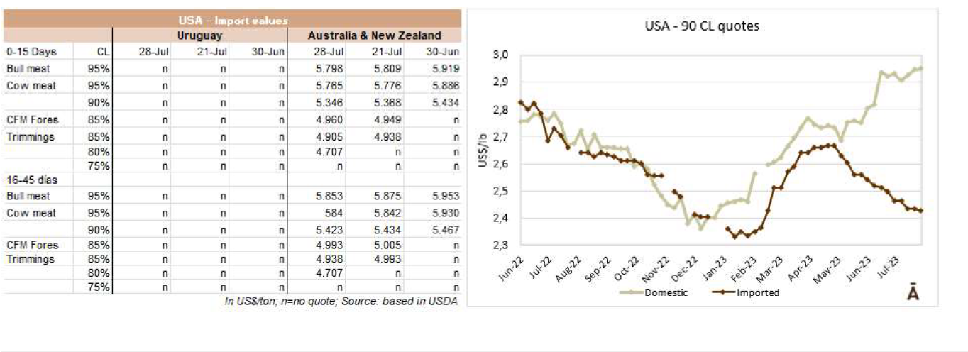 一位貿(mào)易商表示,在大洋洲(新西蘭和澳大利亞)大量牛肉供應(yīng)占主導(dǎo)地位的情況下,美國進口市場并沒有表現(xiàn)出很大的變化。烏拉圭配額內(nèi)牛前部位肉90CL的參考價格為FOB 4550美元每噸。