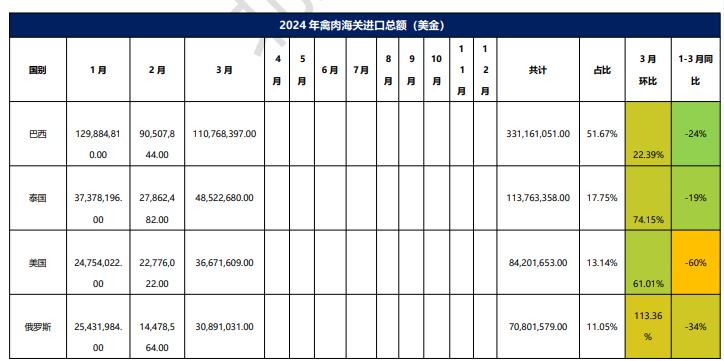 2024年1-3月冷凍禽肉進口概況
