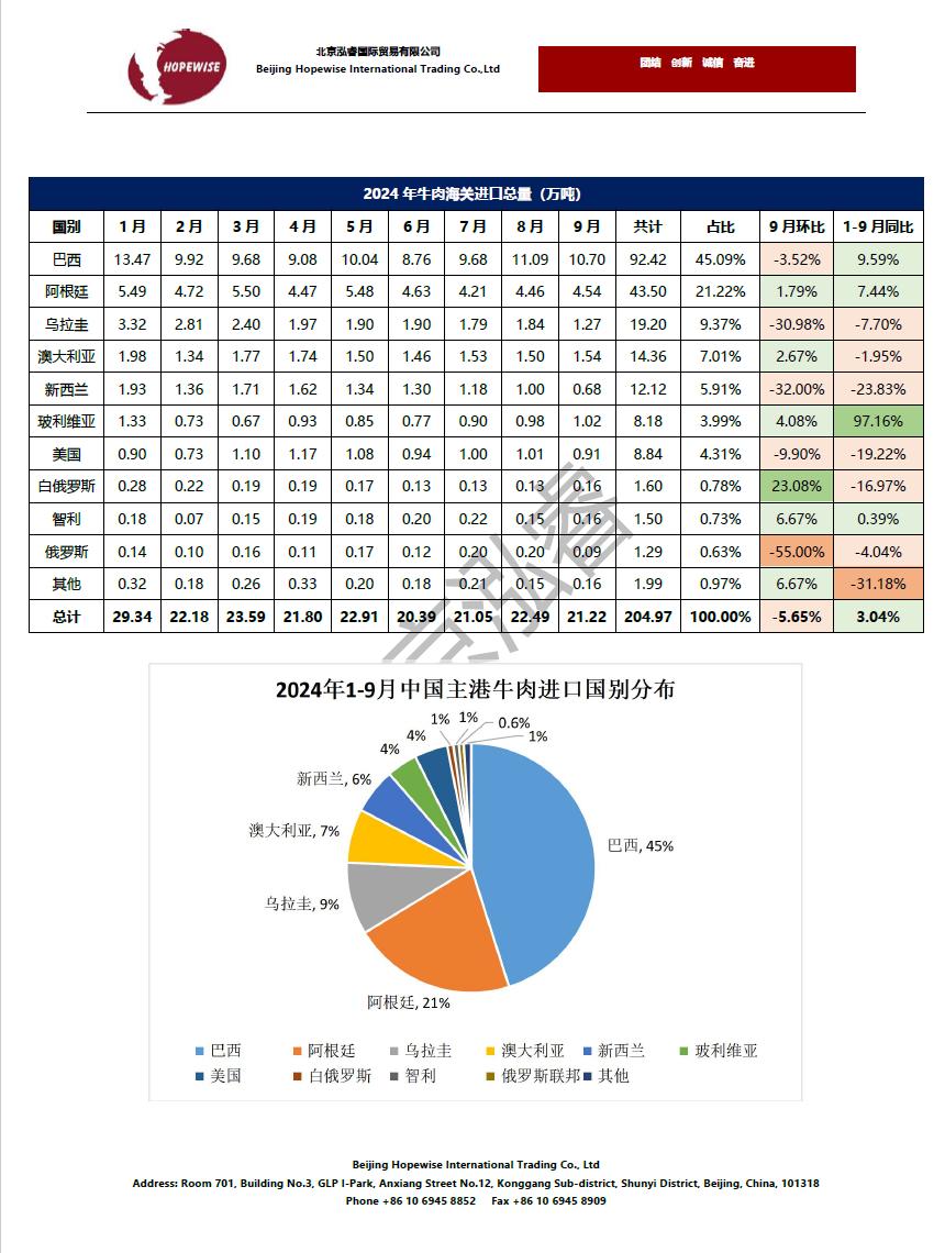2024年1-9月冷凍豬牛禽肉海關進口數據