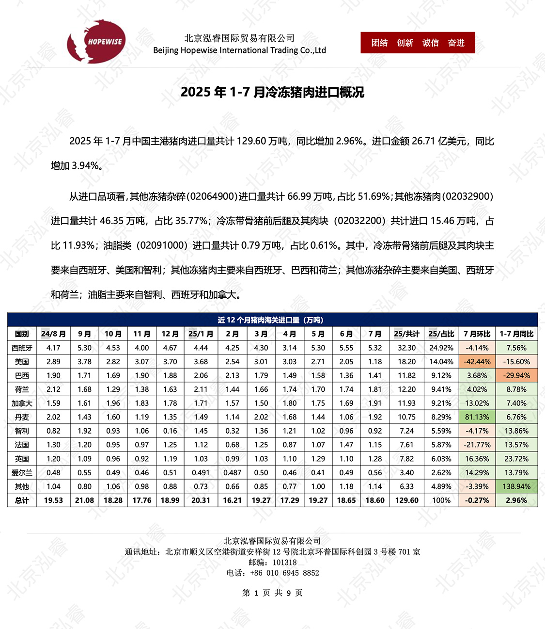 2025 年 1-8 月冷凍豬肉進(jìn)口概況