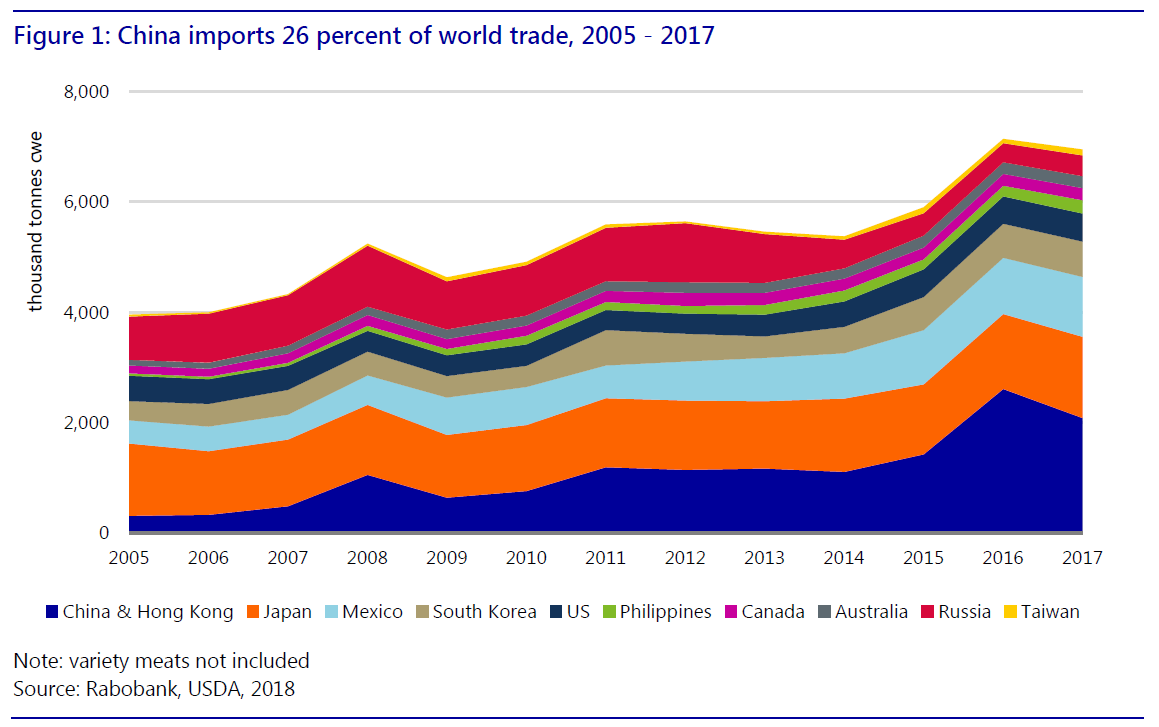 l 中國已成為豬肉和副產(chǎn)品出口最大對象國。其他亞洲國家的豬肉進口需求也在增長。豬肉進口產(chǎn)品除了低貨值種類還包括增值產(chǎn)品。