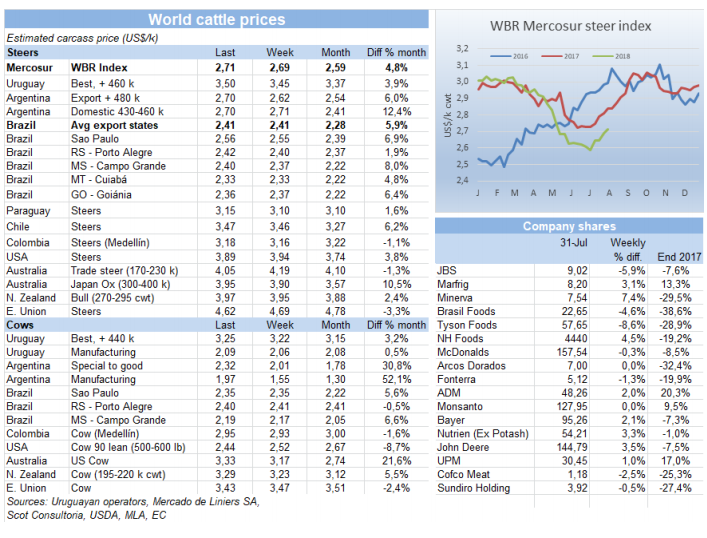南方共同市場(chǎng)閹牛指數(shù)本周漲了2美分到2.71美金,12周以來(lái)最高,本周阿根廷,烏拉圭和巴拉圭牛價(jià)都上漲,巴西保持不變。阿根廷近期牛價(jià)又開(kāi)始強(qiáng)勁上漲,本周漲了2比索,換算成美金價(jià)漲了8美分至2.7美金,比6月中最低的2.43美金高了很多,巴拉圭和烏拉圭供應(yīng)短缺也促使牛價(jià)上漲。巴西本地牛價(jià)微漲,但被貨幣的小幅貶值抵消了。