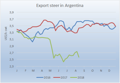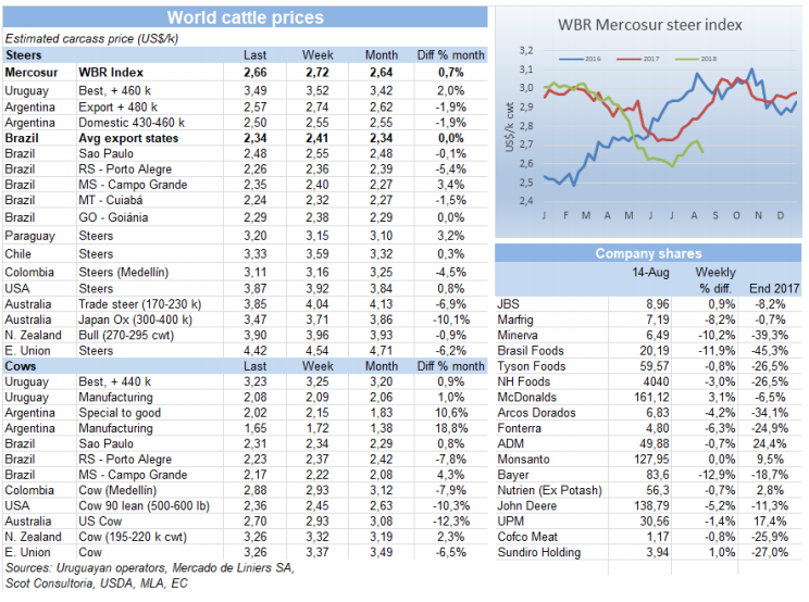 美國(guó)和土耳其的政治危機(jī)嚴(yán)重影響到了新興國(guó)家的貨幣,南方共同市場(chǎng)各國(guó)也受到了影響,本地閹牛均價(jià)被拉低。本周南方共同市場(chǎng)閹牛指數(shù)降低了6美分到2.66美金/公斤,近四周最低。前期由于本地牛價(jià)上漲以及貨幣貶值趨緩,美金牛價(jià)逐漸恢復(fù),此趨勢(shì)被打破,阿根廷比索對(duì)美元貶值8.2%,巴西雷亞爾貶值3.6%。巴西本地育肥牛價(jià)漲到137.1雷亞爾,漲幅0.8雷亞爾,但換算成美元降低了7美分到2.34美金,阿根廷情況也一樣,出口閹牛價(jià)格漲了1比索,但由于貨幣貶值,美金價(jià)減少了17美分至2.57美金。烏拉圭牛價(jià)也顯示出降低趨勢(shì),因?yàn)楠q太團(tuán)隊(duì)即將撤離,開(kāi)始為481配額準(zhǔn)備牛肉生產(chǎn)。本地區(qū)只有巴拉圭一個(gè)國(guó)家牛價(jià)上漲,漲了5美分。