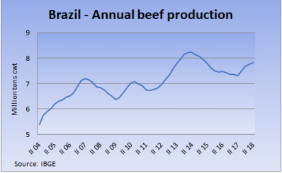 2018年至今,巴西增加了冷鮮牛肉對(duì)南美地區(qū)的出口量,從去年前7個(gè)月的2.6萬(wàn)噸增加到6.1萬(wàn)噸,增加了138%,巴拉圭不能出口智利增加了該市場(chǎng)對(duì)巴西產(chǎn)品的需求,而且巴西相對(duì)于其他國(guó)家牛肉價(jià)格較低,也提高了產(chǎn)品競(jìng)爭(zhēng)力。