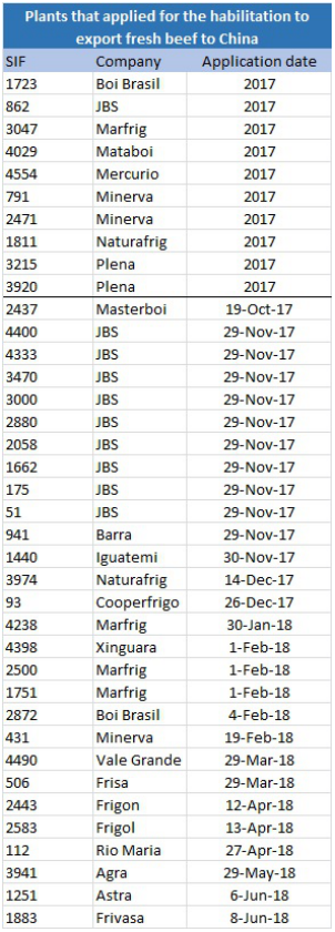 巴西十月前三周出口了9.5萬噸牛肉,均價(jià)3938美金/噸,保持這個(gè)頻率的話,十月總共會發(fā)運(yùn)14.5萬噸,接近九月份創(chuàng)下的15萬噸的記錄。前九個(gè)月出口64.4萬頭活牛,同比增加60.8%。目前38家巴西牛肉工廠申請中國證,其中10家會被優(yōu)先開放,另外28家需等待第二批。由于中美貿(mào)易戰(zhàn),中國政府希望開放其他貨源來彌補(bǔ)美國貨源的損失,所以開放廠家的速度可能會加快。以下是申請中國證的廠家名單,前十家會優(yōu)先開放:
