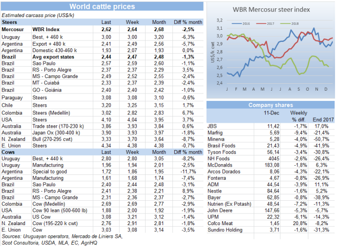 南方共同市場(chǎng)閹牛價(jià)格本周跌了2美分到2.62美金,主要是貨幣疲軟導(dǎo)致。全球的不確定因素對(duì)南美地區(qū)貨幣造成了影響,巴西雷亞爾貶值1.9%,阿根廷比索貶值2.4%,雖然巴西本地牛價(jià)漲了1雷亞爾,美金牛價(jià)還是降低了3美分到2.44美金,阿根廷本地牛價(jià)也因?yàn)闅W洲市場(chǎng)低迷而有所下跌,美金牛價(jià)跌了8美分到2.41美金。巴拉圭和烏拉圭牛價(jià)穩(wěn)定在3.08和3美金。