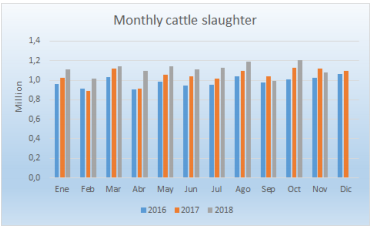 烏拉圭活牛屠宰量今年將超過(guò)236萬(wàn)頭,比2017年略有增加,這是連續(xù)第五年屠宰量增加,其中48%是閹牛,50%是母牛和小母牛,閹牛均重514公斤,母牛458公斤,小母牛408公斤。羊的屠宰量達(dá)到98萬(wàn)頭,近四年最高。