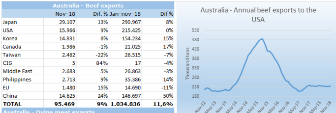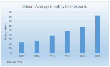 近十二個(gè)月牛肉出口總值達(dá)到16億美金,如果算上副產(chǎn)品和成品,總值達(dá)到19.4億美金,比2017年高4%,出口總量方面跟2017年相差不多,大約45萬(wàn)噸。