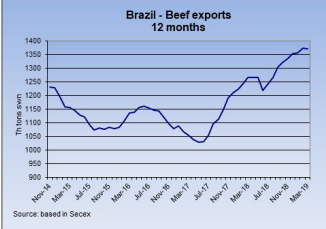 預計2019年阿根廷活牛存欄量會保持在5380萬頭,能繁母牛預計2360萬頭,比2018年略低,母牛屠宰量由于中國出價高而增加,新生牛犢數(shù)量將減少30萬頭。19年屠宰量將達到1330萬頭,比去年略低,如果由于飼草生長良好育肥牛壓欄,飼育場會推遲出售給屠宰廠。今年牛肉產(chǎn)量預計會達到300萬噸,與18年持平,待宰牛均重增加。由于阿根廷比索貶值帶來的利好,牛肉出口量預計會達到58.5萬噸,比18年多7.7萬噸(15%),比17年翻倍,從18年8月到19年1月,65%的牛肉出口去到中國和香港,10%去俄羅斯,10%去歐盟,5%去智利。