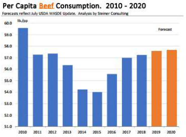 USDA在六月存欄報告出來之后對供應/需求平衡表做了微調,2019年預測牛肉產量調低了7500萬磅,主要原因是平均胴體重量比預期低,并且第三季度屠宰量也有下行的趨勢。產量的減少會被需求端的調整抵消一部分,進口量將增加1000萬磅,出口量會減少1000萬磅,此外人均牛肉消費量也被調低,僅會同比增長0.6%。不過USDA對2020年的預測數據并沒有進行調整,而且雖然牛肉供應量將減少,USDA還是把2019年閹牛價格預測調低了1.3%。