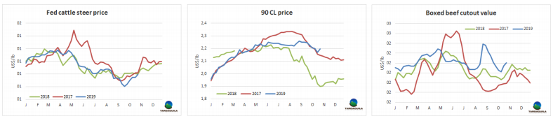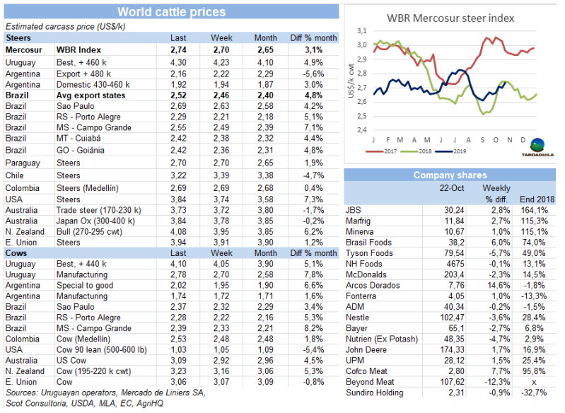 南方市場閹牛價格本周增長4美分,增長至2.74美元/公斤,達(dá)到7月下旬以來最高。屆時阿根廷初選之前比索價格大跌,巴西雷亞爾價格比現(xiàn)在約高7%。從那時起,按雷亞爾計巴西主要出口州育成公牛增長6.6%,阿根廷出口閹牛按比索計增長7.5%。按美元計巴西出口價格下跌2美分,阿根廷由于比索貶值出口價格下跌57美分。本周世界牛肉周報價格指數(shù)巴西參考價增長6美分,烏拉圭增長7美分,阿根廷比索價格和美元價格均下跌,其原因可能是希爾頓產(chǎn)品價格的下行壓力,以及干旱條件導(dǎo)致的價格上漲,也可能是由于周日大選前的銷售提前。巴拉圭價格保持穩(wěn)定。