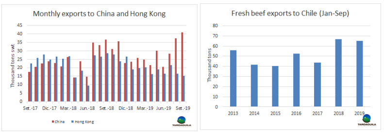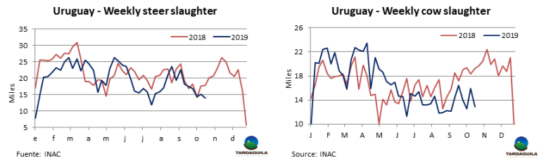 上周牛屠宰量減少是由于草飼牛只短缺和降水引起的裝運(yùn)困難。烏拉圭肉協(xié)報道,10月19日,被批準(zhǔn)的加工廠牛只屠宰量總計33398頭,比上周減少3379頭,減少了9.2%,比去年同期減少10000頭。在周對比中,母牛屠宰量減少3000頭,減少至12906頭。閹牛屠宰量減少1100頭,幼母牛屠宰量增加818頭,增加至5724頭。屠宰量最大的廠是 Minerv-PUL(3779頭),Las Piedras(3114頭),Marfrig-Colonia(2984頭)。Marfrig四家工廠自前一周起共屠宰10478頭牛,Minerva僅PUL一家廠進(jìn)行屠宰活動。10月截至目前,牛只屠宰量96137頭,比去年同期減少22.8%,考慮到上周因降水造成的延誤,本周屠宰量將有增長。但無論如何10月屠宰量與2018年的20.1萬頭相比將減少3.6-3.8萬頭。這將是2013年以來10月份的最低水平。