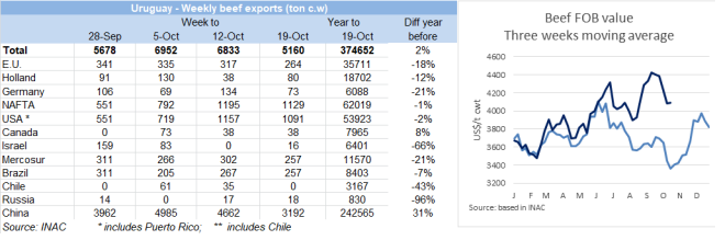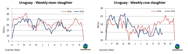 上周牛屠宰量輕度回漲。烏拉圭肉協(xié)報道。上周牛只屠宰量34563頭,比前一周增長1165頭,增長3.5%,比去年同期減少1.2萬頭,去年同期屠宰量4.6萬頭。春季還未完全到來,這為牛只育肥帶來困難。本周屠宰量增長主要來自閹牛,閹牛屠宰量15792頭。增長了13%,母牛屠宰量增長了500頭,增長至13404頭,幼母牛減少了1000頭,減少至4703頭。屠宰量活動最為活躍的廠是 Minerv-PUL(3972頭),Marfrig-Tacuarembo(3349頭),Las Piedras(3246頭)。Marfrig四家工廠共屠宰11097頭牛,屠宰量比上周增加619頭。10月截至26日,牛只屠宰量130700頭,比去年同期減少4萬頭,與去年相比差距繼續(xù)拉大,這將是2013年以來10月份的最低水平。今年截至目前牛只屠宰量184萬頭,比去年減少9.1萬頭。