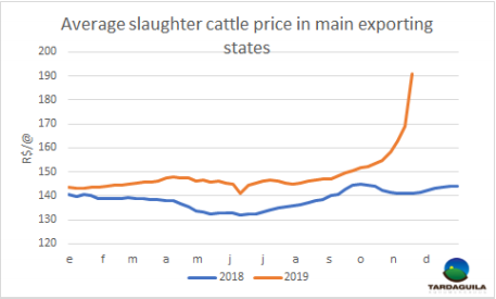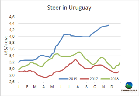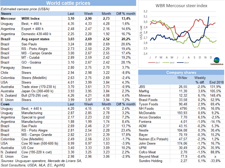 受巴西價(jià)格強(qiáng)勢(shì)增長(zhǎng)影響,南方共同市場(chǎng)閹牛平均價(jià)格強(qiáng)勢(shì)增長(zhǎng),南方市場(chǎng)閹牛價(jià)格指數(shù)本周上漲20美分,上漲至至3.1美元/公斤,達(dá)到自2016年10月三年多以來最高水平。巴西直接出口中國(guó)的工廠增加,需求端對(duì)相對(duì)短缺的供應(yīng)端做出反應(yīng),本周價(jià)格按雷亞爾計(jì)算增長(zhǎng)了13%,按美元計(jì)算增長(zhǎng)了12.4%,主要的出口州老公牛平均胴體價(jià)格3.03美元/公斤,一周內(nèi)增長(zhǎng)了34美分。阿根廷情況則不同,出口閹牛價(jià)格仍然保持10月末的水平,歐洲需求的減少對(duì)價(jià)格有一定影響。巴拉圭市場(chǎng)更加穩(wěn)定,胴體價(jià)格2.8美元/公斤,達(dá)到3月初至今最高。烏拉圭特種閹牛價(jià)格達(dá)歷史最高,胴體價(jià)格4.35美元/公斤,在接下來的幾天價(jià)格會(huì)趨于平緩。