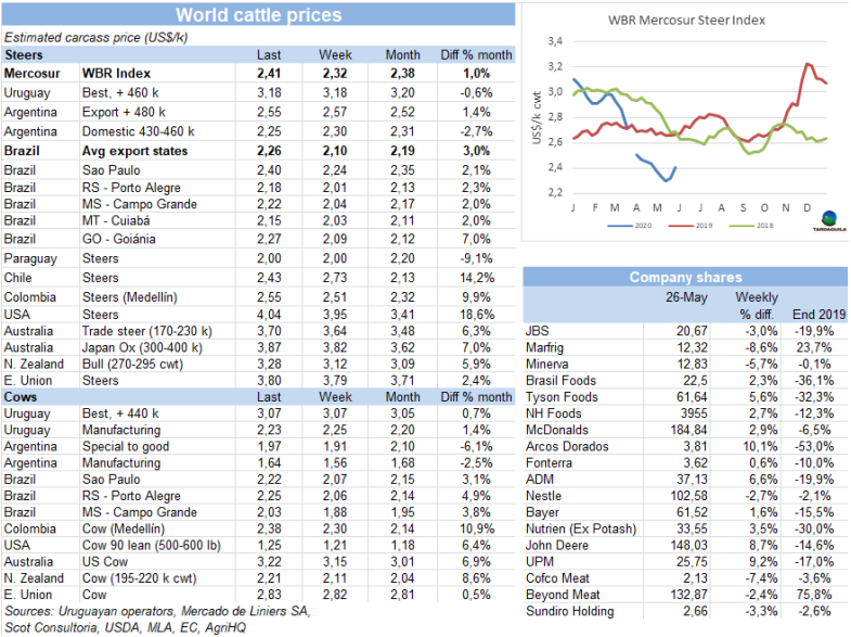 “中國牛肉進(jìn)口商從市場消失了,未來充滿不確定性,進(jìn)口商不愿采購。”一位貿(mào)易商說。四月的成交有人要求議價,中國政府在調(diào)控價格,國企公司出售手里的庫存,允許商品通過水漂渠道進(jìn)入主港。所有這些為高價成交進(jìn)入中國市場的商品帶來了巨大問題。另外有人說中國市場目前對牛肉沒有需求,價格在下跌,一些進(jìn)口商稱巴西向中國市場賣掉了超出預(yù)期的量,這給價格施加壓力。中國客戶稱因為人們的消費(fèi)達(dá)不到以前的水平,市場有大量的庫存,最令人擔(dān)憂的是看不到底。巴西工廠擔(dān)心的是飼育場的牛只屠宰昂貴,雷亞爾對美金匯率開始回漲。一家巴西工廠告訴記者,七月船期的貨已經(jīng)賣完,他們不愿接受目前中國市場對未來船期采購的出價,該工廠提供了上周前后腱賣香港市場的參考價4300美元/噸。另一方面,阿根廷板裝牛前的還價不超過3800美元/噸,較一個月前參考價下跌1000美元。