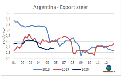 閹牛出口價格保持前兩周的水平,最好的英國純種閹牛保持155-160比索/公斤,印度串種閹牛保持150-155比索/公斤,特優(yōu)種母牛138-142比索/公斤,工業(yè)母牛下跌1比索至119-129比索/公斤。