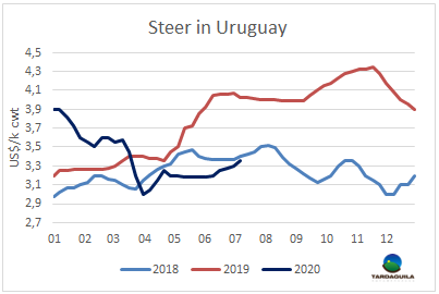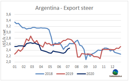 南方共同市場(chǎng)四國(guó)待宰牛平均價(jià)格連續(xù)第二周上漲。南方市場(chǎng)閹牛價(jià)格指數(shù)上漲了5美分,上漲至2.65美元/公斤,達(dá)三月中旬疫情在南美爆發(fā)以來最高。漲幅在3-6美分,受當(dāng)?shù)乩讈啝杻r(jià)格上漲拉動(dòng),盡管匯率漲了1.5%,巴西主要出口州育成牛價(jià)格上漲6美分,上漲至2.53美元/公斤。烏拉圭和巴拉圭牛價(jià)上漲5美分,烏拉圭牛價(jià)在南美地區(qū)最高,達(dá)3.3美元/公斤。巴拉圭牛價(jià)是南美地區(qū)最低,2.4美元/噸。阿根廷出口閹牛價(jià)格上漲3美分,上漲至2.69美元/公斤胴體價(jià),包含9%的牛肉出口稅。