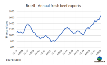 歐盟昨日宣布的大規(guī)模經(jīng)濟(jì)刺激計(jì)劃,以及新冠肺炎疫苗研制進(jìn)展的利好消息,帶動(dòng)了市場(chǎng)的樂觀情緒,推高了主要股指,新興國(guó)家貨幣也有升值。昨天巴西雷亞爾增值2.4%,較一周前增值3%,促進(jìn)牛價(jià)堅(jiān)挺。巴西主要出口州育成牛雷亞爾平均價(jià)格上漲了0.7%,美元價(jià)格上漲0.9美分,上漲至2.62美元/公斤。巴拉圭和烏拉圭牛價(jià)保持冬季一直以來的上行趨勢(shì)。巴拉圭閹牛報(bào)價(jià)2.45美元/噸,烏拉圭牛價(jià)要高出1美元,3.43美元/噸。阿根廷出口閹牛比索價(jià)格與上周保持不變,由于比索官方匯率珠江下跌,美元價(jià)格下跌2美分至2.81美元/公斤。南方共同市場(chǎng)活牛價(jià)格指數(shù)本周上漲5美分,上漲至2.74美元/公斤。