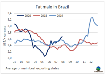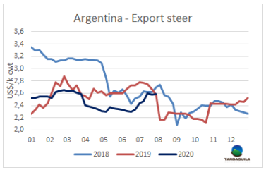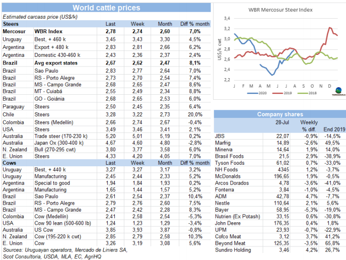 本周南美國家待宰牛價格上漲,上漲趨勢受到密切關(guān)注。南方共同市場閹牛價格指數(shù)上漲4美分,至2.78美元/公斤,達(dá)三月上半月新冠疫情在南美地區(qū)爆發(fā)以來新高。較五月中旬牛價低點(diǎn)時上漲了48美分,上漲了21%。巴西,按本地雷亞爾計的成交價再次上漲。本周美元在全國范圍內(nèi)下跌,而巴西雷亞爾升值1.2%。巴西主要出口周育成牛價格上漲5美分,上漲至2.67美元/公斤。巴拉圭由于在口蹄疫接種階段活牛供應(yīng)量少,價格保持上漲趨勢。阿根廷和烏拉圭活牛參考價本周上漲2美分,分別上漲至2.83美元/公斤和3.45美元/公斤。烏拉圭目前已經(jīng)看到價格上漲趨勢將在本季度后停止。