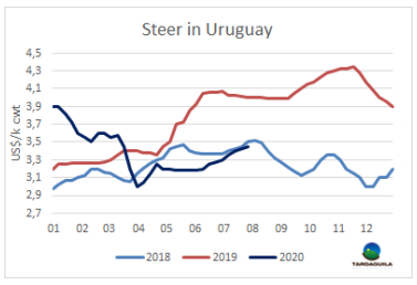 上周牛屠宰量增長超過6000頭,達(dá)六月末至今四周以來最高。烏拉圭肉協(xié)報道,截止7月25日的一周內(nèi),牛屠宰量37487頭,較上周增長了20%,同比增長了10%。周屠宰量最大種類是閹牛,閹牛屠宰量較上周增長了2821頭,增長至19364頭,母牛屠宰量的也有同水平的增長,增長了2895頭,增長至12664頭。屠宰量最大的工廠是Marfrig-Tacuarembó (5040頭),Athena-Pulsa(4949頭)和Las Piedras(3734頭)。Marfrig兩家工廠屠宰量8746頭,美麗華兩家工廠屠宰量7803頭。距月末僅余一周的時間,7月牛只屠宰總量124716頭,較2019年同期130375頭稍有減少。由于牛肉行業(yè)工會周二舉行了長達(dá)24小時的罷工,本周的屠宰活動可能會減少。