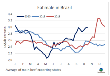 屠宰工廠為出口中國準備的牛的活牛支付高價的階段已經(jīng)基本過去了,能滿足春節(jié)需求的船期大多數(shù)都在十一月中旬,很明顯很多出口商已經(jīng)完成銷售。圣保羅育成牛成交價261-265雷亞爾/15公斤,較上周上漲了3雷亞爾/15公斤。本周初市場較為平靜,可能是由于預(yù)期國內(nèi)需求將在本月下半月趨于平靜。盡管大部分地區(qū)牛家有所上漲,但米內(nèi)羅三角和戈亞尼亞等地區(qū)的牛價上周沒有發(fā)生變化。