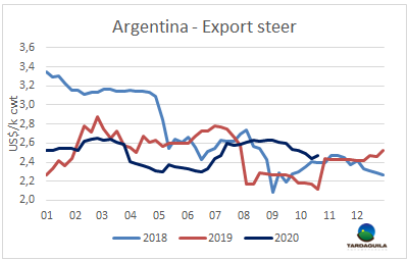 盡管歐洲市場由于疫情爆發(fā)價格下跌,最好的閹牛價格回到了兩周前的水平。最好的英國純種閹牛目前成交在188-193比索/公斤。印度串種閹牛185-190美元/噸。特優(yōu)母牛價格與上周持平,170-178比索。工業(yè)母牛價格繼上周上漲了14比索后又上漲了5比索,目前價格在160-165比索。
