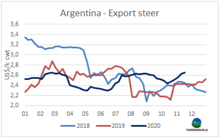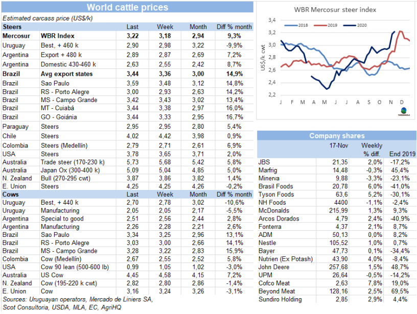 南方共同市場閹牛價格指數(shù)本周再次上漲4美分,上漲至3.22美元/公斤,達2019年11月至今一年以來最高。影響閹牛價格指數(shù)上漲的主要因素還是巴西牛價,盡管近幾周來上漲趨勢有可能停止的跡象。股市指標大幅上升,包括雷亞爾在內(nèi)的新興國家貨幣也大幅上升。巴西主要出口州育成牛價格本周上漲8美分,上漲至3.44美元/公斤,拉大了與其他地區(qū)的差距。巴西牛價上漲是由于本地牛價上漲和匯率上漲導(dǎo)致的。阿根廷和巴拉圭牛價保持堅挺,本周上漲2美分,阿根廷出口閹牛價格上漲至2.98美元/公斤,包含9%的出口稅。巴拉圭牛價保持2.95美元/公斤。烏拉圭牛價下行趨勢仍然持續(xù),草飼閹牛2.9美元/公斤,較阿根廷僅高1美分,阿根廷牛價仍為南美地區(qū)最低。