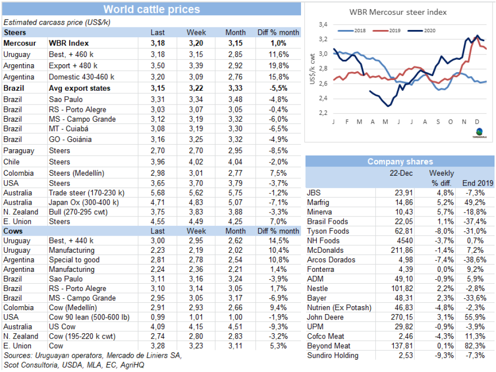 上周牛屠宰量再度下降,近四周內(nèi)屠宰量累計(jì)下降了10000頭。烏拉圭肉協(xié)報(bào)告,截止12月19日合規(guī)屠宰場(chǎng)牛屠宰量達(dá)44805頭,較上周下降了3577頭,較去年同期增長(zhǎng)了7000頭。母牛屠宰量有下跌,母牛和小母牛屠宰量均有15%的下跌,本周分別下跌至16375頭和6268頭。相反,閹牛屠宰量增加了4%,至21328頭。本周屠宰量最高的工廠是Athena-Pulsa(5148頭),Marfrig-Tacuarembo(4870頭)和LasPiedras(4139頭)。Marfrig四家工廠屠宰量14319頭,美麗華兩家廠屠宰量8616頭,均保持上周水平。12月截止19日,牛屠宰量133053頭,與2019年屠宰量水平相當(dāng)。