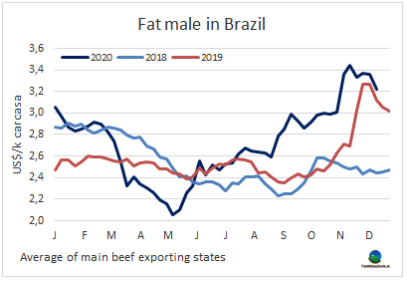 一直持續(xù)到上周三的育成牛價(jià)格下跌趨勢(shì)開始疲軟。自11月中旬開始,圣保羅牛價(jià)下跌了超過30雷亞爾/15公斤,約11%。本周期貨市場(chǎng)育成牛價(jià)格上漲了9-15雷亞爾/15公斤。批發(fā)市場(chǎng)帶骨牛肉銷量非常好,已經(jīng)賣到什么都不剩,這也影響了育成牛價(jià)格的預(yù)期,盡管去骨部位肉市場(chǎng)仍然沉重。圣保羅30天付款的育成牛價(jià)格本周上漲了1雷亞爾/15公斤,上漲至256雷亞爾/15公斤,其他活牛市場(chǎng)周變化大部分是下降的,但圣保羅市場(chǎng)的堅(jiān)挺應(yīng)該會(huì)在未來幾天對(duì)其他州產(chǎn)生影響。