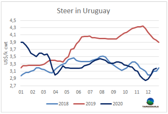 11月平均閹牛類型價(jià)值下降至1094美元/頭,較去年12月達(dá)到的最高值下降了20%,完全扭轉(zhuǎn)了2019年5月開始的上漲,當(dāng)時(shí)非洲豬瘟疫情在中國(guó)的影響開始充分體現(xiàn)。與10月數(shù)據(jù)相比,閹牛類型價(jià)值下降了3美元/頭。烏拉圭肉協(xié)稱,該數(shù)字的下降似是由于出口部位肉價(jià)格的下跌和國(guó)內(nèi)市場(chǎng)胴體價(jià)格的下跌。雜碎和副產(chǎn)品價(jià)格保持穩(wěn)定。鮮皮價(jià)格較10月有所上漲。閹牛采購(gòu)價(jià)格也有下降,平均每頭僅下降了9美元。烏拉圭肉協(xié)稱工業(yè)附加值收縮了25美元至211美元/頭。