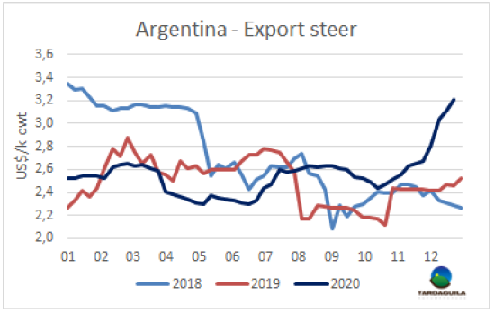 在活牛價(jià)格飆高、出口市場(chǎng)價(jià)格低迷的背景下,至少有六家工廠決定暫停圣誕節(jié)到1月4日的屠宰活動(dòng),這些工廠包括Swift,Gorina,ArreBeef,SanJorge,Frimsa和Rafaela。暫停屠宰活動(dòng)有助于維持牛價(jià),對(duì)閹牛需求的下降將有助于價(jià)格下降,通常也會(huì)在1月份發(fā)生,因?yàn)樯a(chǎn)者的供應(yīng)量將比12月份增多。