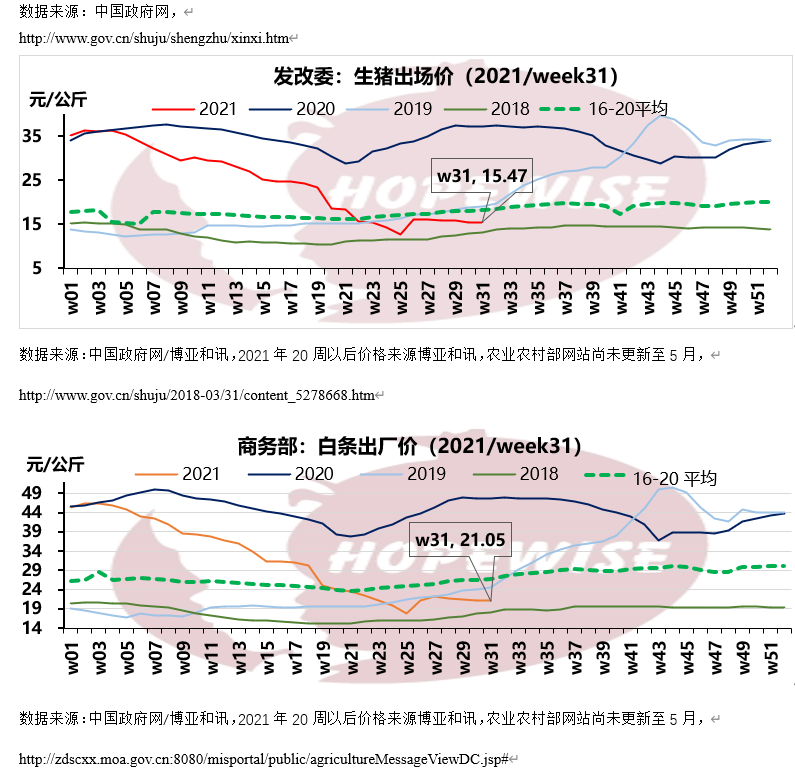 2021年7月全國生豬均價15.71元/kg,環(huán)比上漲7.24%,同比下滑56.98%。白條均價21.49元/kg,環(huán)比上漲7.72%,同比下滑54.25%。7月高溫天氣抑制豬肉消費,屠企開工率低,凍品庫存大,豬肉市場整體呈現(xiàn)供大于求。