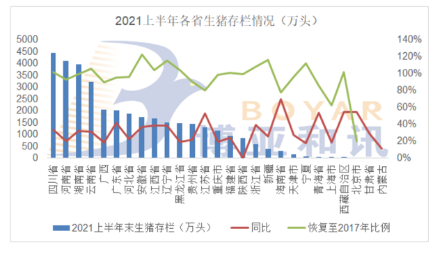 7月,生豬存欄2.97億頭,環(huán)比增加3.7%,同比增加31.89%。能繁母豬存欄3448萬頭,環(huán)比減少0.17%,同比減少1.02%。母豬存欄有所下降,低效母豬淘汰增加,三元母豬占比降至4成以內(nèi)。根據(jù)各省生豬存欄數(shù)據(jù),四川存欄量4451.7萬頭;河南存欄4101.12萬頭;湖南存欄3952.1萬頭。各省生豬存欄與2017年相比,除了北京、上海、青海、海南、江蘇、廣西外,其他省份已經(jīng)恢復至2017年的90%以上。四川、云南、安徽、江西、遼寧、黑龍江、福建、浙江、新疆、寧夏、西藏11省已經(jīng)超過2017年存欄量。