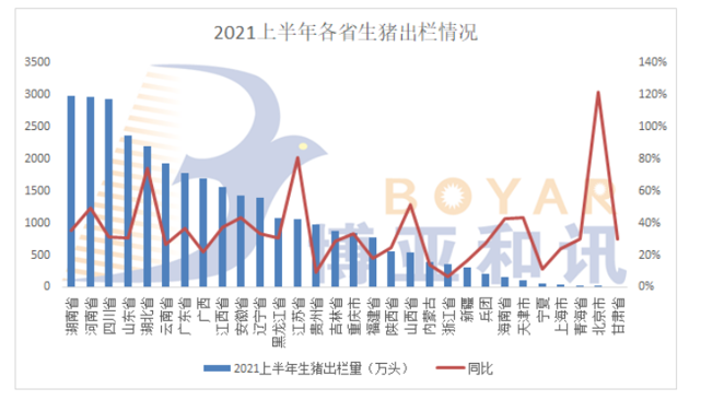 根據(jù)各省統(tǒng)計局公布的生豬出欄數(shù)據(jù),排名前三省份上半年出欄量均在2900萬頭以上。其中,湖南出欄量2980.3萬頭,同比增長35.2%。河南出欄量2966.53萬頭,同比增長49.8%。四川出欄量2928.7萬頭,同比增加31.4%。上半年,全國生豬出欄3.3億頭,同比增長34.4%。