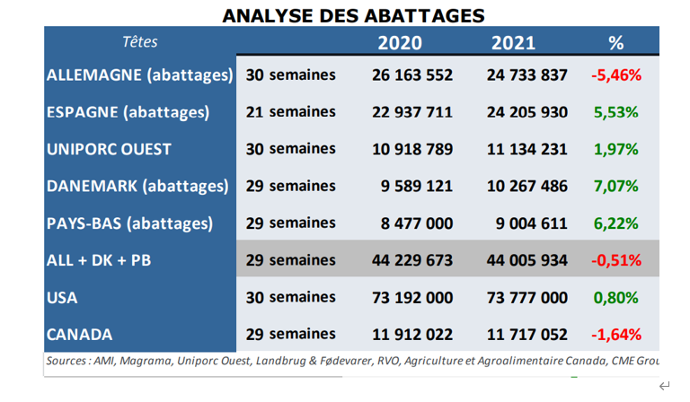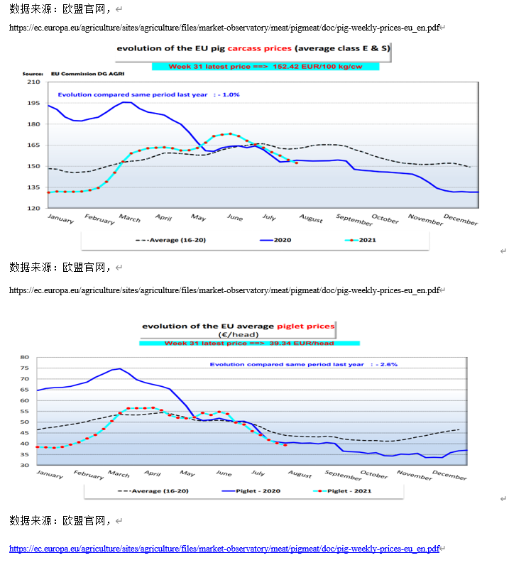 2021年歐盟7月豬胴體均價1.52歐元/kg,環(huán)比下滑6.23%,同比下滑0.46%。7月歐洲本地消費恢復緩慢。另外,中國豬肉進口需求疲軟,豬價承壓下行。丹麥豬胴體價格1.58歐元/kg,環(huán)比下跌8%,同比下跌5.5%。德國豬胴體價格1.49歐元/kg,環(huán)比下跌5%,同比下滑13%。西班牙豬胴體價格1.69歐元/kg,環(huán)比下跌9.9%,同比上漲7.3%。