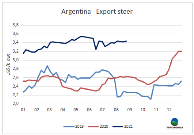 據(jù)阿根廷牛肉推廣局(IPCVA)基于國家統(tǒng)計(jì)和人口普查數(shù)據(jù)的一份報(bào)告,7月阿根廷牛肉出口量36113噸(相當(dāng)于約50600胴體重量),出口額約1.95億美元,不包括內(nèi)臟。7月出口量比6月下降了0.5%(這反過來表明出口庫存比5月暴跌了45%),出口量較2020年同期低33.4%。7月出口額較6月增長(zhǎng)了22.6%,但與2020年7月相比同比下降15.2%。7月平均出口價(jià)格較上月上漲18%,較2020年7月上漲27.4%。上一個(gè)移動(dòng)年阿根廷牛肉出口量達(dá)89萬噸。IPCVA表示,在上一個(gè)移動(dòng)年(2020年8月至2021年7月),出口量接近89萬噸,出口額接近26.6億美元。僅在2021年前7個(gè)月,阿根廷牛肉出口量達(dá)到了334341噸,比去年同期增長(zhǎng)近2%,其中76.6%出口到中國。今年前7個(gè)月阿根廷隊(duì)中國牛肉出口量增長(zhǎng)了185%,而其他國家的牛肉出口量累計(jì)萎縮了85%。